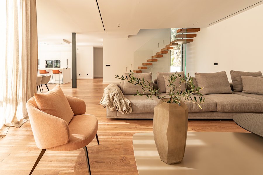 This outstanding villa is located in the green and quiet area of Son Roqueta next to Son Vida, the exclusive residential area in northern Palma. The house was finished in 2020 with great taste and attention to detail. It consists of three levels. As soon as you enter the property, you realise its exclusivity. For example, the pool has been adapted to the harmonious shape of the cul-de-sac, a special style of the 28 sqm pool. Around the house there is a lot of space for outdoor activities, especially for children. The ground floor, most of which has 2,6m floor-to-ceiling windows, houses the living room and the adjoining open-plan kitchen and dining area, the whole space flooded with sunlight all day long from the south-east facing property. On the same level, there is a large multifunctional room and a full bathroom with shower. An elegant staircase leads to the second floor where there are three further double bedrooms, each with its own dressing room. The master bedroom has an en suite bathroom and has its own terrace. Details such as floor-to-ceiling doors, corner windows and underfloor acclimation, which ensures a pleasant indoor temperature both on cold days and in the summer, give the chalet its special character.