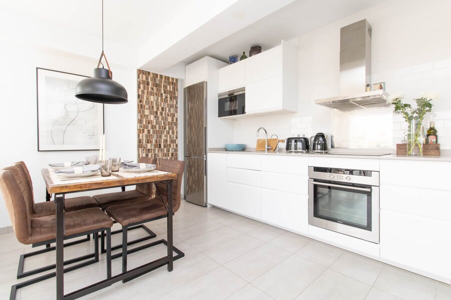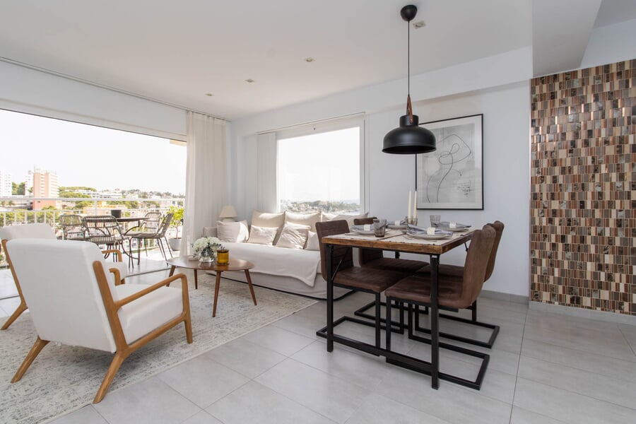 Dieses wunderschöne Penthouse bietet eine seltene Gelegenheit, das mediterrane Leben von seiner besten Seite zu genießen – in der begehrten Gegend von San Agustín. Die Wohnfläche beträgt ca. 74 m² und umfasst zwei großzügige Doppelschlafzimmer sowie ein großes, hochwertig ausgestattetes Badezimmer. Der offene Grundriss verbindet die moderne Küche mit Ess- und Wohnbereich und schafft so einen idealen Ort für geselliges Beisammensein. Große Glastüren lassen sich vollständig zur Terrasse öffnen und ermöglichen ein harmonisches Innen-Außen-Wohnerlebnis. Von der privaten 10 m² großen Terrasse eröffnet sich ein atemberaubender Meerblick – perfekt zum Entspannen und Unterhalten. Die Wohnung befindet sich im 4. Stock einer gepflegten Wohnanlage mit Pool, in unmittelbarer Nähe zum Hafen Cala Nova, zu Stränden, Geschäften und Restaurants. Das Zentrum von Palma ist nur 10 Minuten entfernt – ein ideales Zuhause oder Feriendomizil.