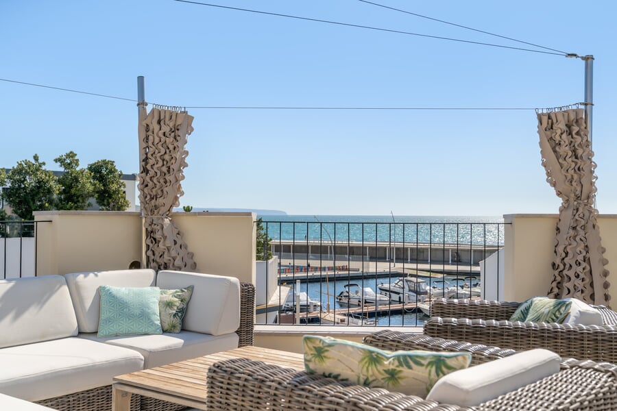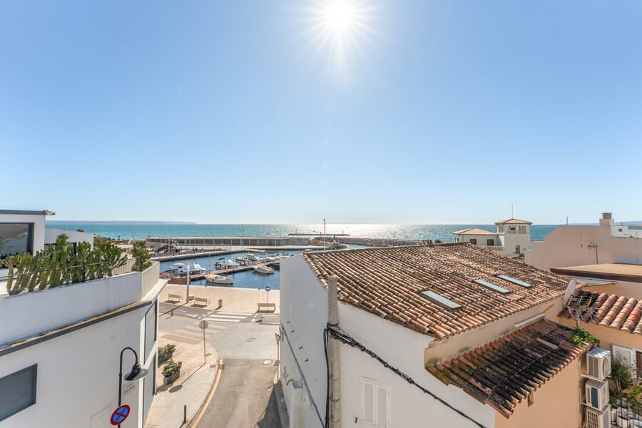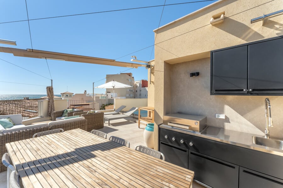 This exceptional five-bedroom luxury home is located in a prime corner position, just half a block from the seafront in Molinar, one of Palma’s most sought-after coastal areas. Built in 2020 and maintained in perfect condition, the property has been sparingly used as a holiday home. Perfectly distributed over three levels of almost 90 sqm per floor, and a total of approximately 268 sqm, comfortably connected by both an elegant staircase and a lift serving all floors, including the spectacular roof terrace. On the entrance level are two bedrooms and two bathrooms, as well as access to the private parking space. Downstairs are two additional bedrooms, a bathroom, a large storage room and a laundry room. The upper living level is the true heart of this home. Here you will find a jaw-dropping living room with kitchen and dining in open plan. High ceilings, lots of natural light and lovely sea views. The high end kitchen with Miele appliances and the carrera marble worktop integrates seamlessly into the space, creating an ideal setting for entertaining. Adjacent to the living area is the master suite with en-suite bathroom, as well as a guest toilet. At the top of the property awaits the highlight- an extraordinary private roof terrace with a pool, outdoor shower, spacious chill-out lounge corner, large dining area as well as a quality outdoor kitchen - perfect for Mediterranean al-fresco dining with family and friends. Sun sails and outdoor curtains, create shade, privacy and and additional outdoor living room atmosphere. This property is sold fully furnished with high quality designer furnitures and includes also a Sonos sound system. There is also the possibility to purchase the art and the car separately, offering a truy turn-key luxury home ready to enjoy immediately. For sale EXCLUSIVELY by BUY A HOME MALLORCA.