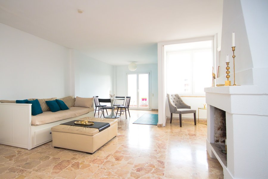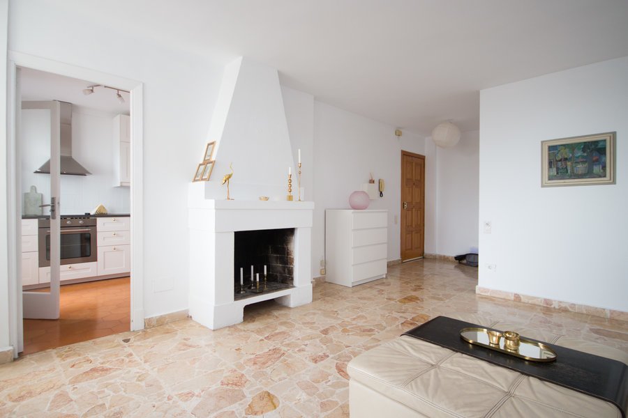 Big duplex apartment on the 4th floor in a well maintained building from 1973 in El Terreno right outside the center of Palma. Spacious living room with a fireplace, large windows with sea views and exit to a terrace.